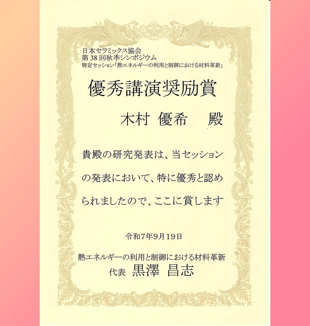 | 賞名 | 日本セラミックス協会第38回秋季シンポジウム特定セッション「熱エネルギーの利用と制御における材料革新」優秀講演奨励賞 |