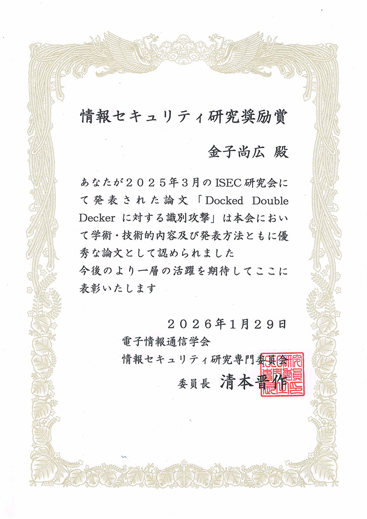 | 賞名 | 電気情報通信学会 情報セキュリティ研究奨励賞 |