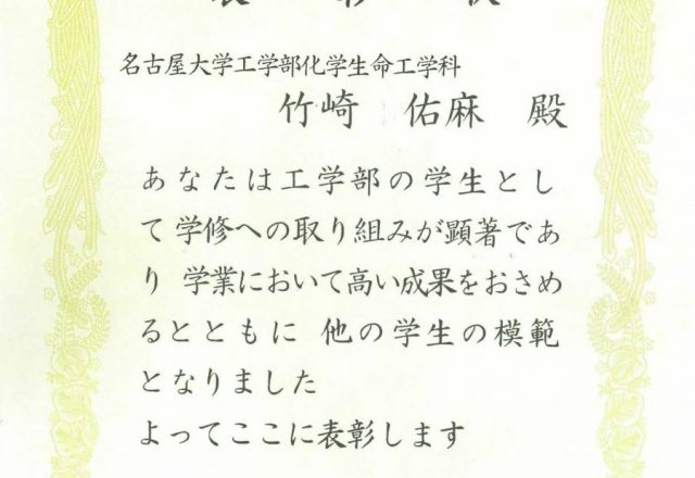 竹崎 佑麻さん(長田研究室・B4)が名古屋大学工学部長賞を受賞しました。