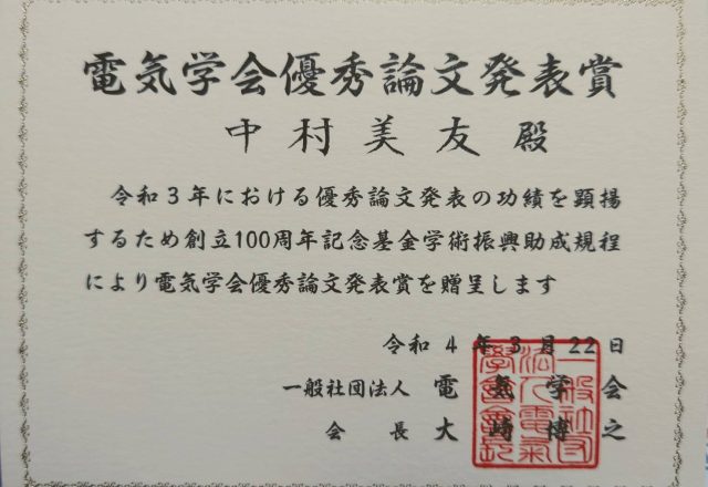 中村 美友さん(加藤(丈)・杉本研 M1)が電気学会 優秀論文発表賞(B部門新エネルギー・環境技術委員会研究会)を受賞