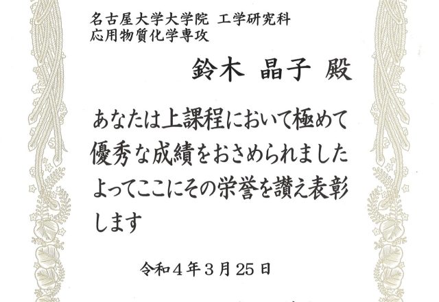 鈴木 晶子さん(長田研・M2)が日本化学会東海支部支部長賞を受賞