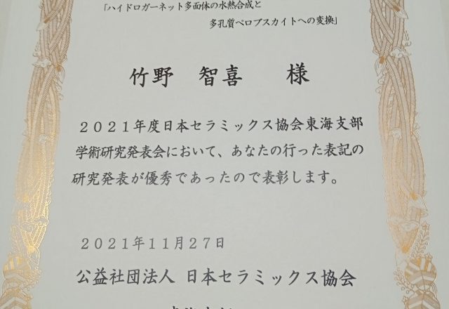 竹野 智喜さん(中西研究室・M1)が日本セラミックス協会 東海支部学術研究発表会 優秀講演賞を受賞