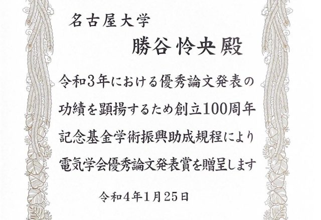 勝谷 怜央さん(加藤・杉本研 M1)が令和3年度 電気学会優秀論文発表賞を受賞