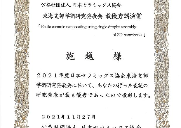 施 越さん(長田研 研究機関研究員)が2021年度日本セラミックス協会 東海支部学術研究発表会 最優秀講演賞を受賞