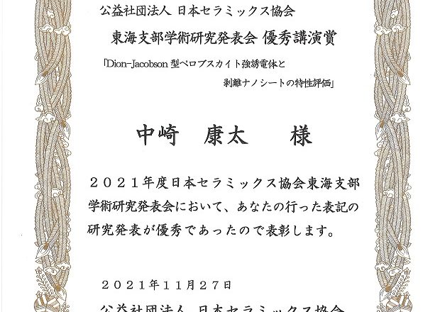 中崎 康太さん(長田研究室・M2) が2021年度日本セラミックス協会 東海支部学術研究発表会 優秀講演賞を受賞