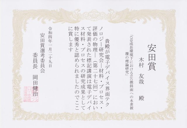 木村 友哉さん (白石研究室 M2) が電子デバイス界面テクノロジー研究会 安田賞を受賞
