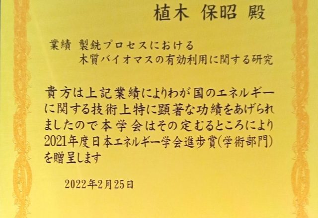 植木 保昭 准教授が2021年度日本エネルギー学会進歩賞(学術部門)を受賞