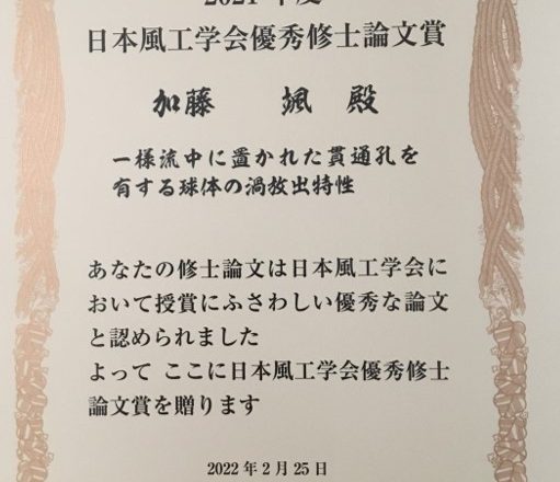 加藤 颯さん (内山研究室 M2) が2021年度日本風工学会優秀修士論文賞を受賞