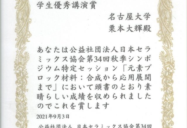 栗本 大輝さん(長田研究室・M1)が日本セラミックス協会 第34回秋季シンポジウム学生優秀講演賞を受賞