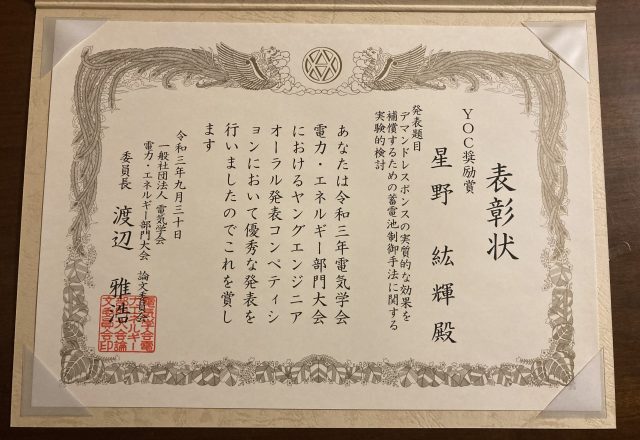星野 紘輝さん(加藤・杉本研 M2)が令和3年 電気学会 YOC (Young engineer Oral presentation Competition) 奨励賞を受賞