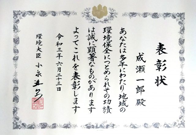 成瀬 一郎教授が 環境省 令和3年度 地域環境保全功労者表彰を受彰