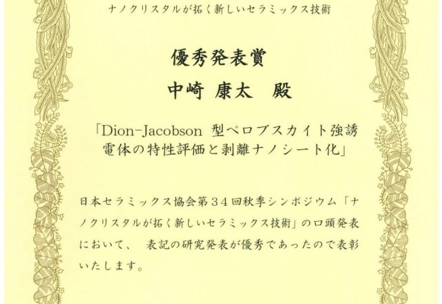 中崎 康太さん(長田研究室・M2)が日本セラミックス協会 第34回秋季シンポジウム 優秀発表賞を受賞