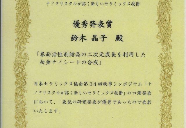 鈴木 晶子さん(長田研究室・M2)が日本セラミックス協会 第34回秋季シンポジウム 優秀発表賞を受賞