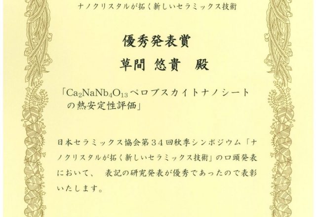 草間 悠貴さん(長田研究室・M1)が日本セラミックス協会 第34回秋季シンポジウム 優秀発表賞を受賞