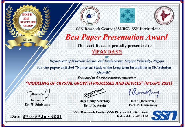 DANG Yifanさん(宇治原研究室 D2)がSSNRC Best Paper Presentation Awardを受賞