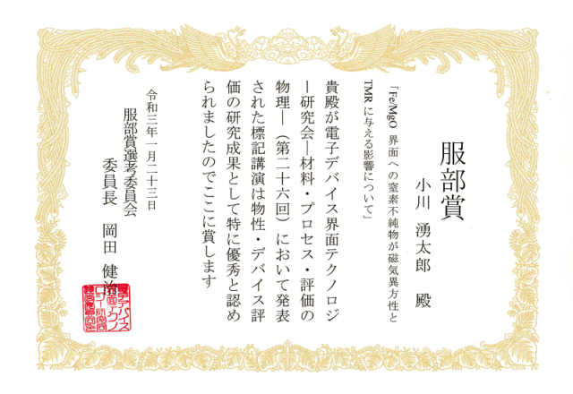 電子デバイス界面テクノロジー研究会・服部賞