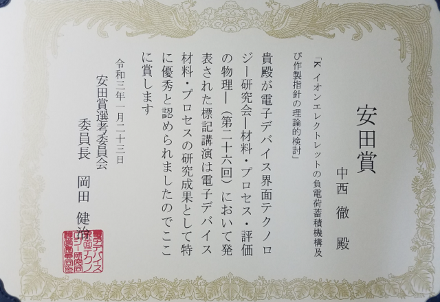 電子デバイス界面テクノロジー研究会・安田賞