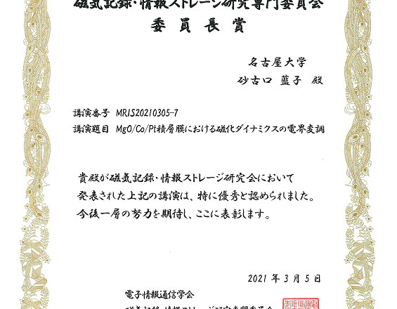 砂古口藍子さん(加藤(剛)研・M2)が電子情報通信学会で磁気記録・情報ストレージ研究専門委員会 委員長賞 受賞