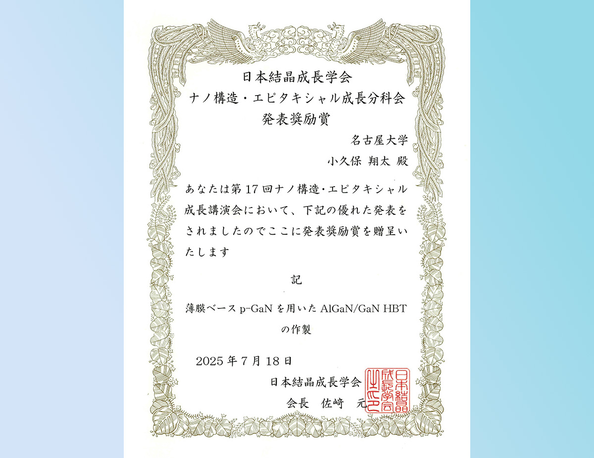 | Award | Shota KOKUBO (M2, Amano-Honda Lab.) received the Paper Award for Young Scientists, The 17th nano structure and epitaxial growth meeting. |
