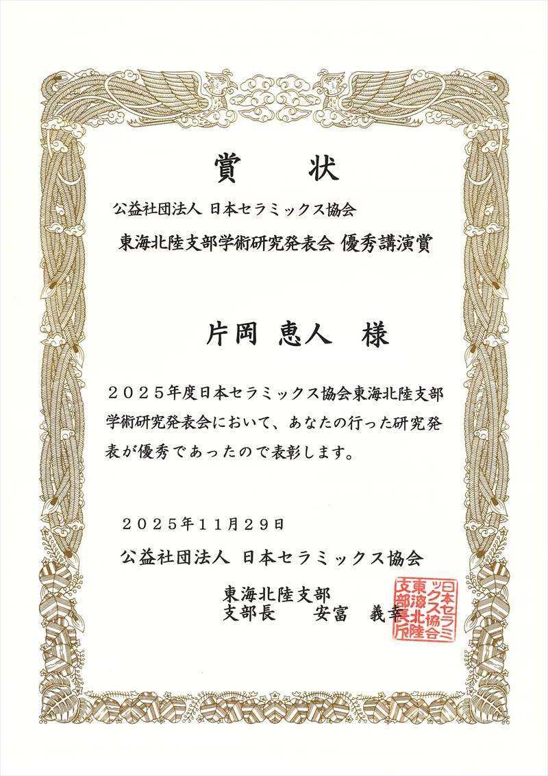 | Award | The Student Excellent Presentation Award at the 2025 Tokai Hokuriku Branch Academic Research Presentation of The Ceramic Society of Japan |