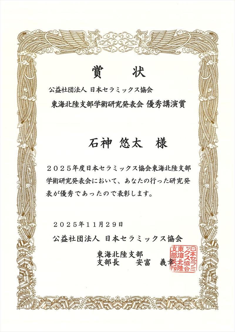 | Award | The Student Excellent Presentation Award at the 2025 Tokai Hokuriku Branch Academic Research Presentation of The Ceramic Society of Japan |