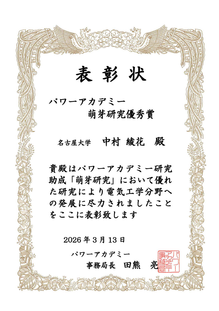 | Winner | Designated Assistant Professor Ayaka NAKAMURA (Energy Systems (Chubu Electric Power) Funded Research Division) |