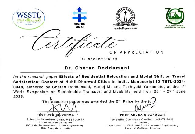 Chetan Doddamani, Malayath Manoj, and Toshiyuki Yamamoto received the second prize at the 1st World Symposium on Sustainable Transport and Livability.
