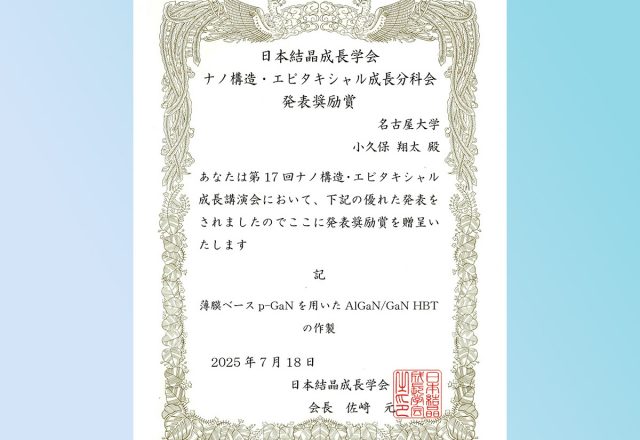 Shota KOKUBO (M2, Amano-Honda Lab.) received the Paper Award for Young Scientists, The 17th nano structure and epitaxial growth meeting.