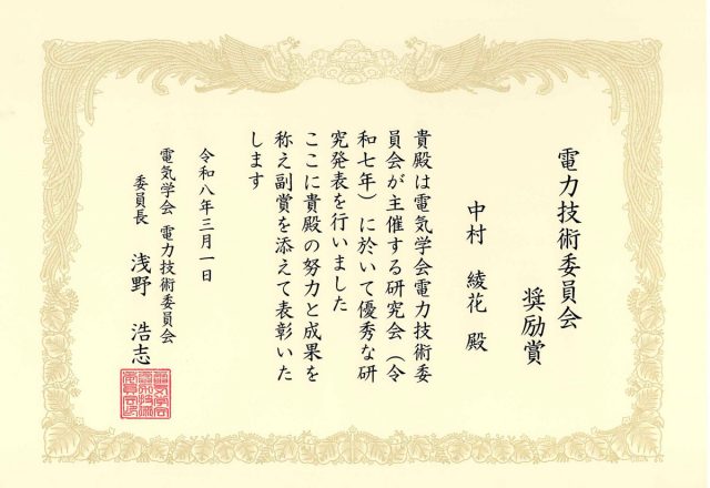 Designated Assist. Prof. Ayaka NAKAMURA has received the Power Engineering Committee Encouragement Award