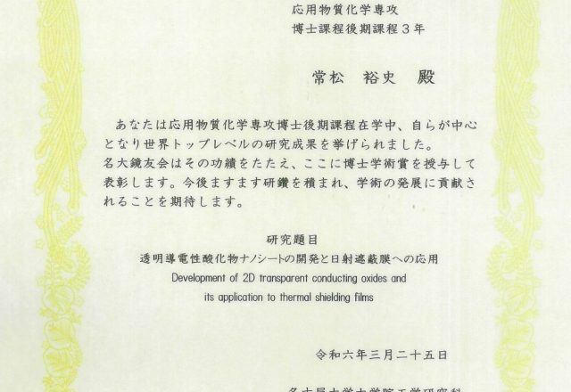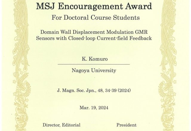 Kosuke KOMURO (Kato Lab., D1) received the Magnetics Society of Japan Encouragement Award.