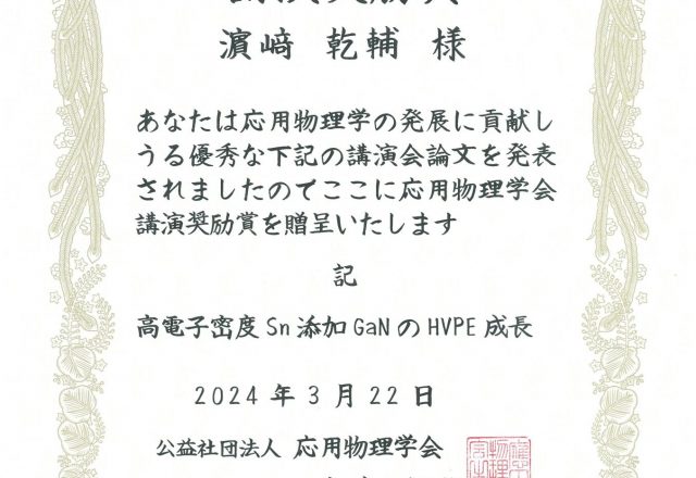 Kansuke HAMASAKI (M2, Amano Lab.) received the Young Scientist Presentation Award, The Japan Society of Applied Physics.