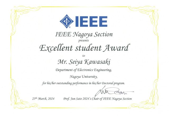 Seiya KAWASAKI(D3, Amano Lab.)received the IEEE Nagoya Section Excellent student Award.