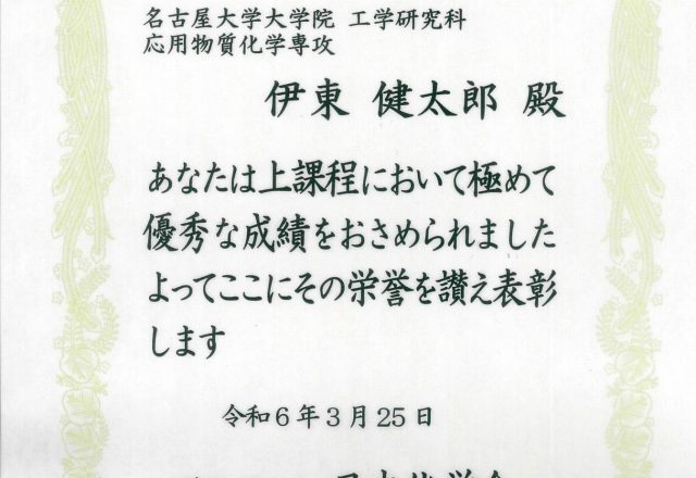 Kentaro Ito (Osada Lab., M2) received the Chemical Society of Japan Tokai Branch Chief Award.