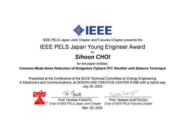 Sihoon CHOI (D2, Yamamoto Lab.) received the IEEE PELS Japan Young Engineer Award.