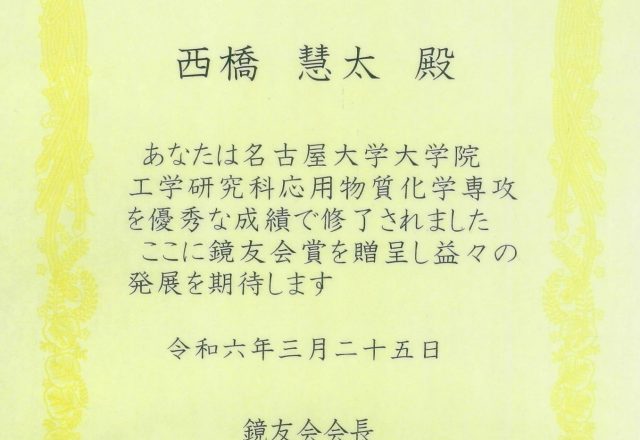 Keita Nishibashi (Osada Lab., M2) received the Kyoyu-kai Award.