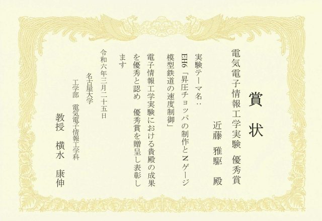 Gaku KONDO (B4, Yamamoto Lab.) received the Electrical, Electronic and Information Engineering Experiments Excellence Award.