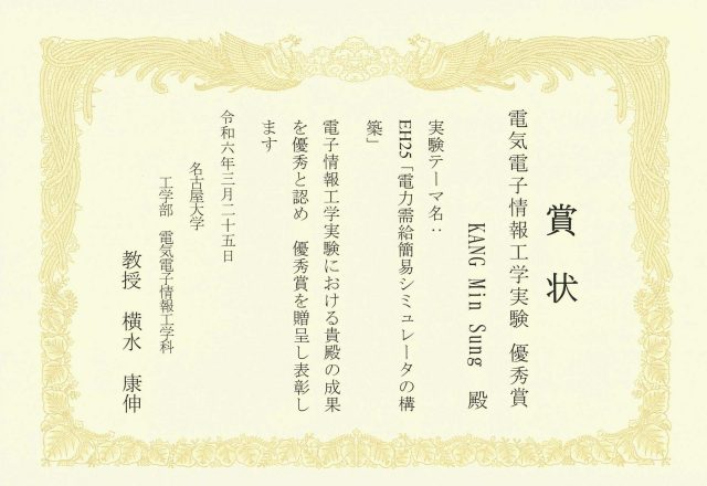 KANG Min Sung (B4, Yamamoto Lab.) received the Electrical, Electronic and Information Engineering Experiments Excellence Award.