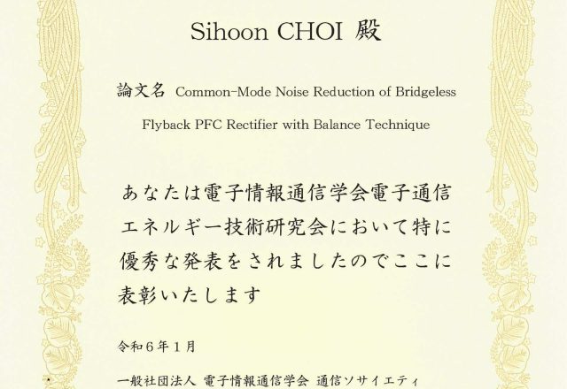 CHOI Sihoon (D2, Yamamoto Lab.) received the Young Engineer Paper Presentation Award.