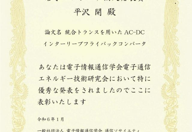 Haruki HIRASAWA (M2, Yamamoto Lab.) received the Young Engineer Paper Presentation Award.