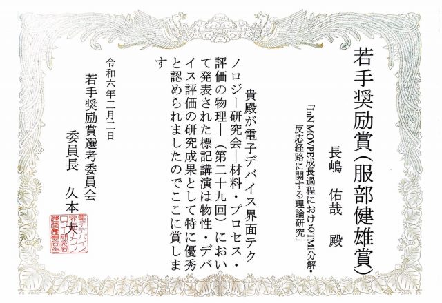Satoshi Yamada (Osada Lab., M2) received the Best Presentation Award, Tokai Branch Academic Research Meeting of The Ceramic Society of Japan 2023.