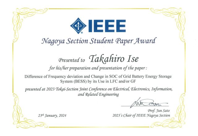Takahiro Ise ( M1, Kato Lab.) received IEEE Nagoya Section Student Paper Award.