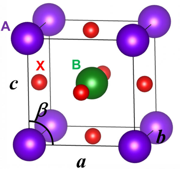 図1: ペロブスカイト型結晶構造の模式図。黒線で示す六面体が単位格子を示す。今回の研究対象であるBiFeO3では、A、B、Xで示す位置にBiイオン、Feイオン、Oイオンがそれぞれ配置している。結晶構造はVESTA(K. Momma and F. Izumi, "VESTA 3 for three-dimensional visualization of crystal, volumetric and morphology data," J. Appl. Crystallogr., 44, 1272-1276 (2011).)を用いて描画した。