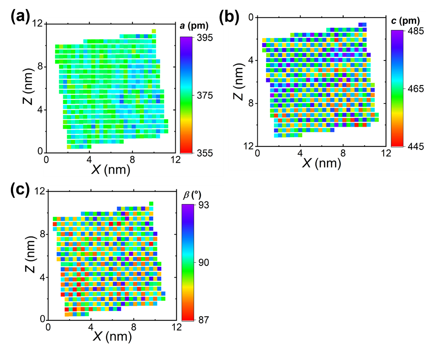 図2:高精度原子分解能STEM法で測定した(a)格子定数a、(b)格子定数cおよび(c)角度βのマップ。a、cおよびβはそれぞれ、図1に示す単位格子で表記されているものに対応する。