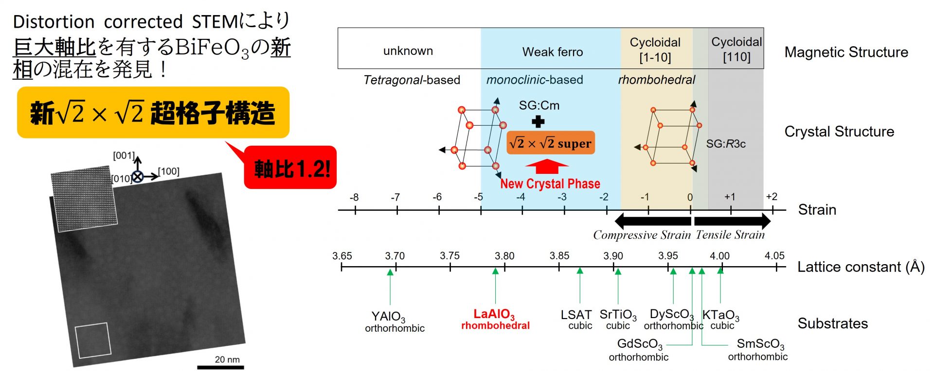 • 本研究では、先端電子顕微鏡により、ビスマスフェライト薄膜中に√2×√2の周期を持つ新しい結晶相を発見した。