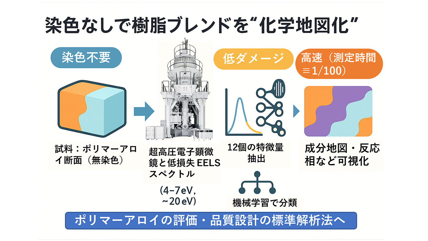 ポリマー材料は軽量で成形が容易なだけでなく、さまざまな物理特性を持つポリマーを混ぜ合わせることで所望の特性を実現できる点で“未来の材料”として期待されています。一般にポリマーは炭素を主な骨格として、酸素、窒素、水素という軽元素から成る互いに似た構造単位から成り、異なるポリマーをナノメートル分解能で区別するために従来は、重金属染色や電子損傷を避ける特殊な電子顕微鏡観察技術が必要でした。本研究グループは、名古屋大学が誇る大型電子顕微鏡(反応科学超高圧電子顕微鏡)と電子エネルギー損失分光(EELS)を用い、化学結合の特徴を表す低エネルギー損失スペクトルを使って計測時間を従来の約100分の1に短縮、試料ダメージを抑えつつ成分ポリマーの混ざり具合や化学状態を素早く地図化する方法を示しました。