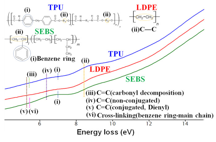 図1:アロイ化する三つのポリマー種の基本化学構造とそれぞれのLow-loss領域のスペクトル。