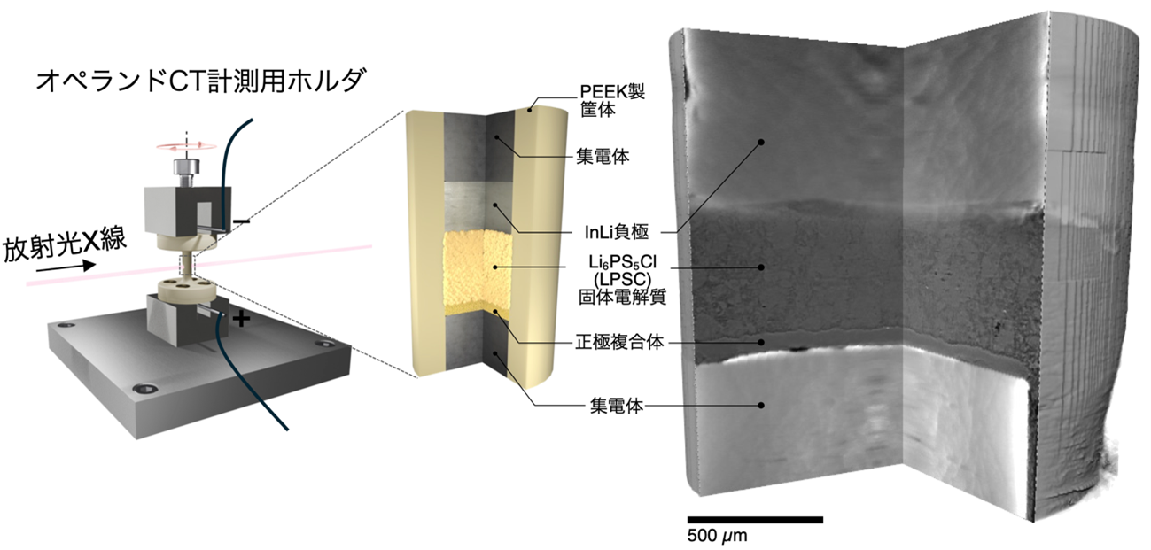 図1. オペランドX線CT測定の概要。(左)オペランド(電池動作下)計測セルとその内部のSSLSBセルの構造。比較的低エネルギーの高輝度放射光X線と独自開発した計測セルにより、電池動作中の反応分布の測定を実現した。