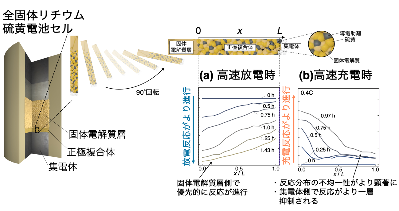 図2. SSLSB正極の厚み方向の充放電反応分布の可視化。(a)高速放電時の反応分布。固体電解質層側(x=0)で優先的に反応が進行し、集電体側(x=L)では反応が抑制される。(b)高速充電時の反応分布。放電時よりも不均一性が顕著で、集電体側では反応がほとんど進まず、充電後もリチウム化した硫黄が残存する。