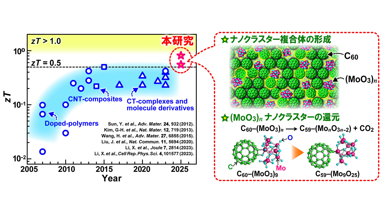 名古屋大学大学院工学研究科の中谷 真人 准教授、尾上 順 教授らの研究グループは、名古屋大学未来材料・システム研究所の小川 智史 准教授 および電源開発株式会社の西井 俊明 上席研究員(兼名古屋大学工学研究科招聘教員)と共同で、フラーレン分子と金属酸化物ナノクラスターを複合化することで、有機熱電材料において世界最高の熱電性能指数が発現することを発見しました。