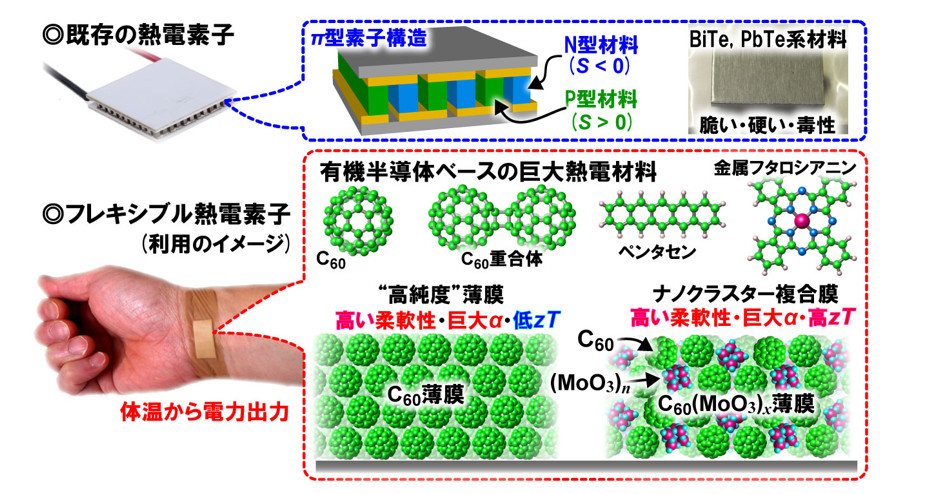 体温を電気に変える熱電素子は、超スマート社会の人体装着型センサー用電源としての利用が期待されています。熱電素子を人体に密着させ体温から電力を得るためには、柔らかく軽量で高性能な有機熱電材料が必要不可欠です。熱電材料は、材料の電気伝導率 σ、ゼーベック係数 α、絶対温度 T、熱伝導率 κ を用いて、無次元性能指数 zT = σα2T/κ で性能が評価され、実用化の目安である zT > 1 を実現するために、σ と α を増加させ、κ を抑制するさまざまな提案がなされてきました。しかしながら、「 σ と α のトレードオフの関係」および「 σ と κ の比例関係」の物理法則により、zT = 0.5 を超える有機熱電材料の創製が非常に困難でした。これに対し、本研究グループは、フラーレン膜に酸化モリブデンナノクラスターをドープすることで zT = 0.81 とこれまでの有機熱電材料として世界最高性能を有することを見出しました。
